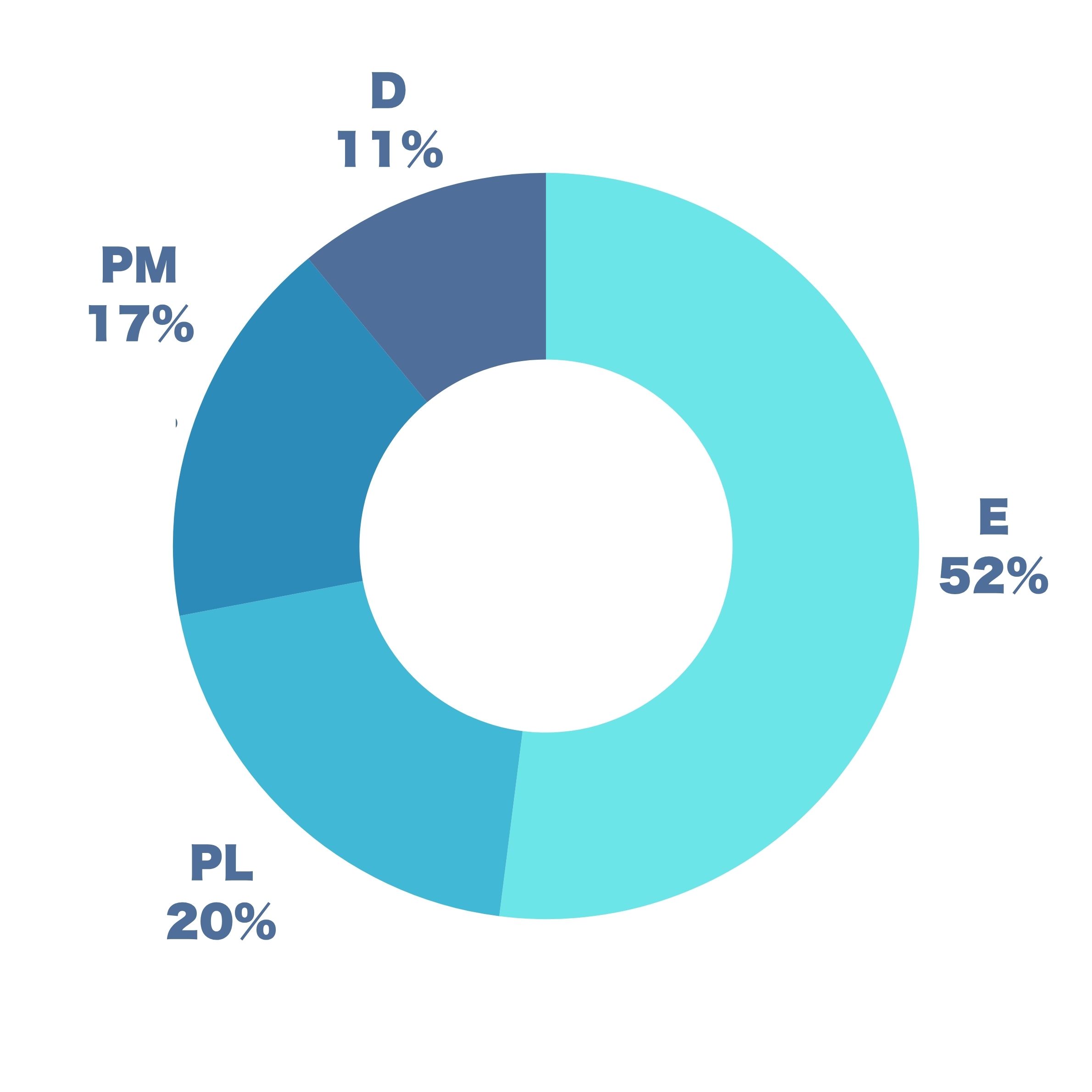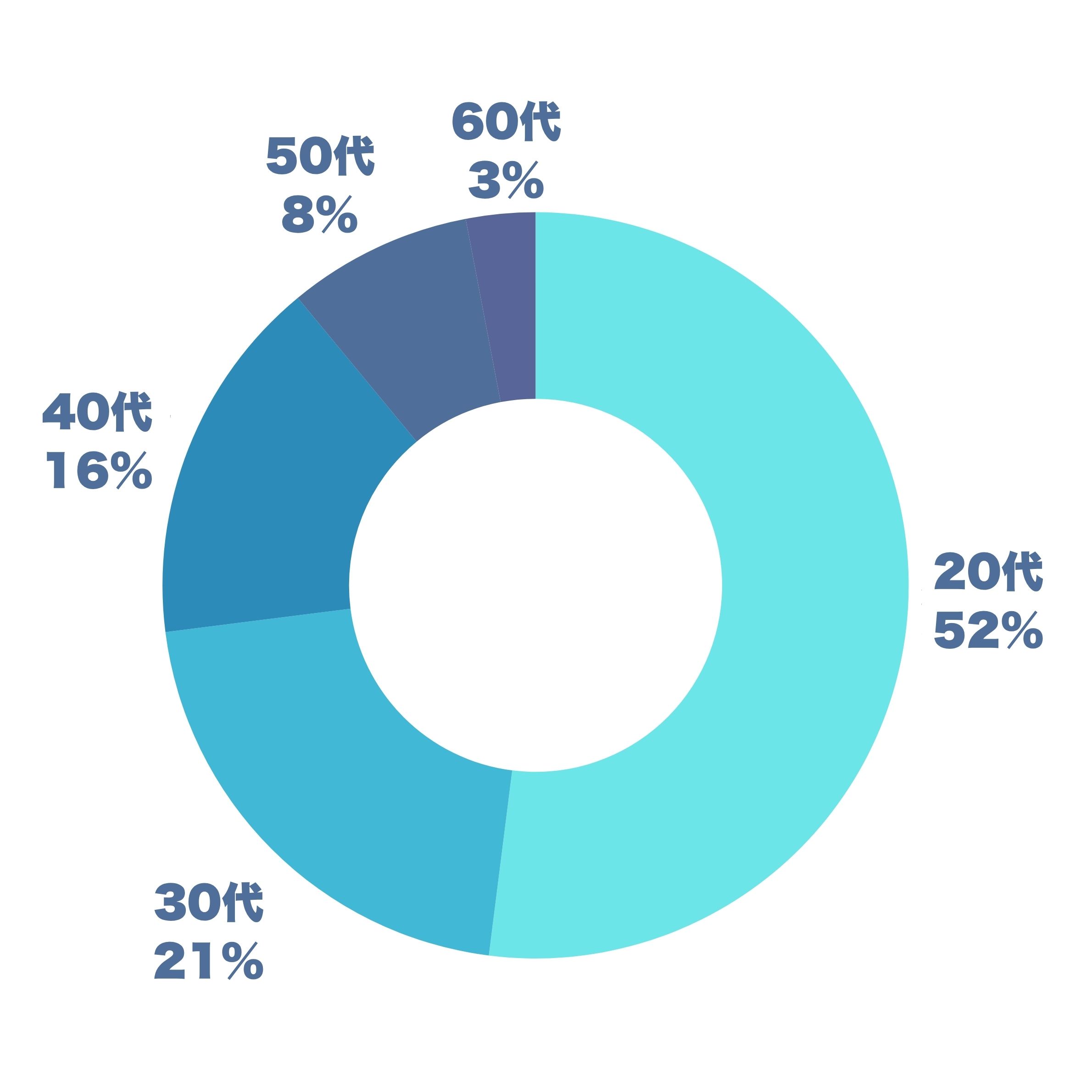 エンジニア52%と技術職が半数を占め、強い開発力を基盤とした組織です。加えて、リーダーやマネージャーが約4割を占めることで、プロジェクト推進力とマネジメント体制の両立を実現。技術・運営・戦略がバランスよく機能するチーム構成がKQRMの強みです。